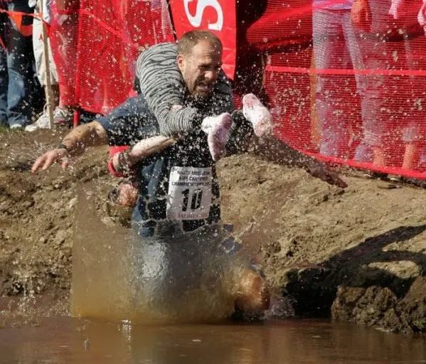 این ورزش در کشور فنلاند به وجود آمده و در سال ۱۹۹۹ راه خود را به آمریکای شمالی نیز باز کرد. در این مسابقه، هر تیم از یک مرد و یک زن تشکیل شده و مرد سعی میکند در حالیکه زن را بر دوش خود گرفته، از موانع و مراحل موجود عبور کند و خود را به خط پایان برساند. در انتهای بازی، هر کس که بتواند فاصله تعیین شده را در مدت زمان کمتری طی کند، برنده مسابقه خواهد بود.