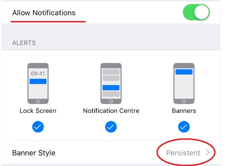 سپس ، به منوی تنظیمات آیفون خود بروید و Notifications را انتخاب کنید، سپس به پایین بروید تا واتساپ را پیدا کنید. در صفحه بعد، مطمئن شوید که اعلان های شما فعال هستند، سپس روی Banner Style ضربه بزنید و آن را به Persistent تغییر دهید.