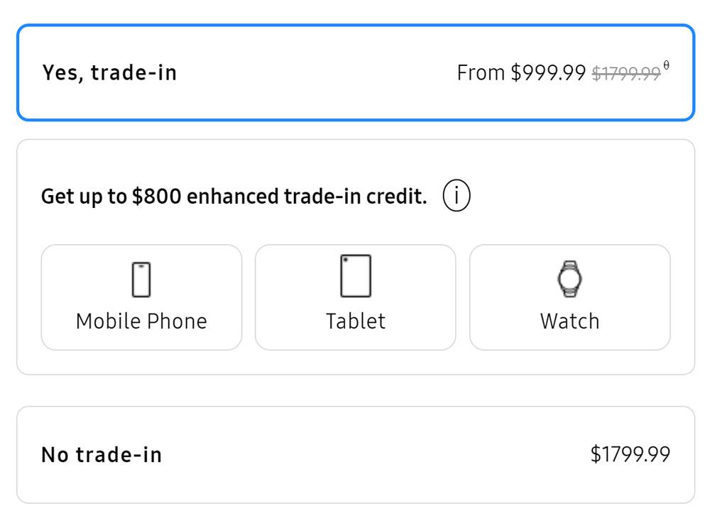 دارندگان دستگاههای هوشمند معرفی شده در چند سال اخیر از جمله تبلت، موبایل و ساعت هوشمند میتوانند با تعویض دستگاههای خود هنگام پیش خرید محصولات جدید سامسونگ تا سقف ۱۵۰۰ دلار اعتبار دریافت کنند. درحال حاضر امکان ثبت چهار دستگاه در هنگام ثبت فرم پیش خرید جهت تعویض وجود دارد اما مبلغ کلی آنها نباید از حد مجاز گفته شده فراتر شود.