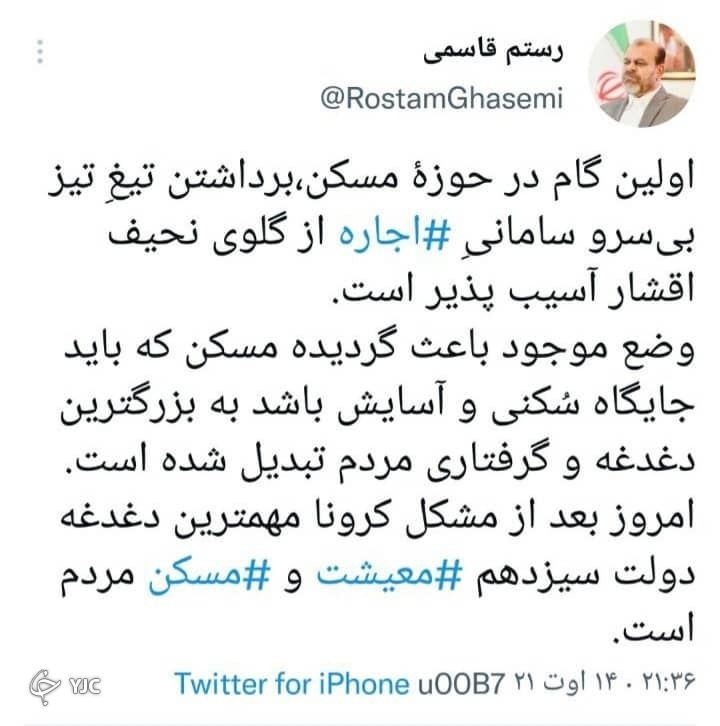 به گزارش سایت طلا ،رستم قاسمی وزیر پیشنهادی وزارت راه و شهر سازی در توئیتی نوشت: ‏اولین گام در حوزه مسکن،برداشتن تیغِ تیز بی‌سرو سامانیِ ‎اجاره از گلوی نحیف اقشار آسیب پذیر است. وضع موجود باعث شده مسکن که باید جایگاه سُکنی و آسایش باشد به بزرگترین دغدغه و گرفتاری مردم تبدیل شده است. امروز بعد از مشکل کرونا مهمترین دغدغه دولت سیزدهم ‎معیشت و ‎مسکن مردم است.