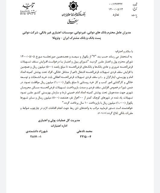 در این بین، بانک مرکزی به منظور انجام اقدامات لازم در این راستا افزایش سقف فردی تسهیلات قرض الحسنه را در بخشنامه‌ای به مدیران عامل بانک‌های دولتی، غیردولتی، موسسات اعتباری غیر بانکی، شرکت دولتی