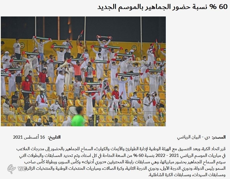 به گزارش سایت طلا به نقل از رسانه البیان دبی، فدراسیون فوتبال امارات تصمیم گرفته است که تمامی دیدارهای این فصل و مسابقات بین المللی را با حضور ۶۰% هواداران برگزار کند.