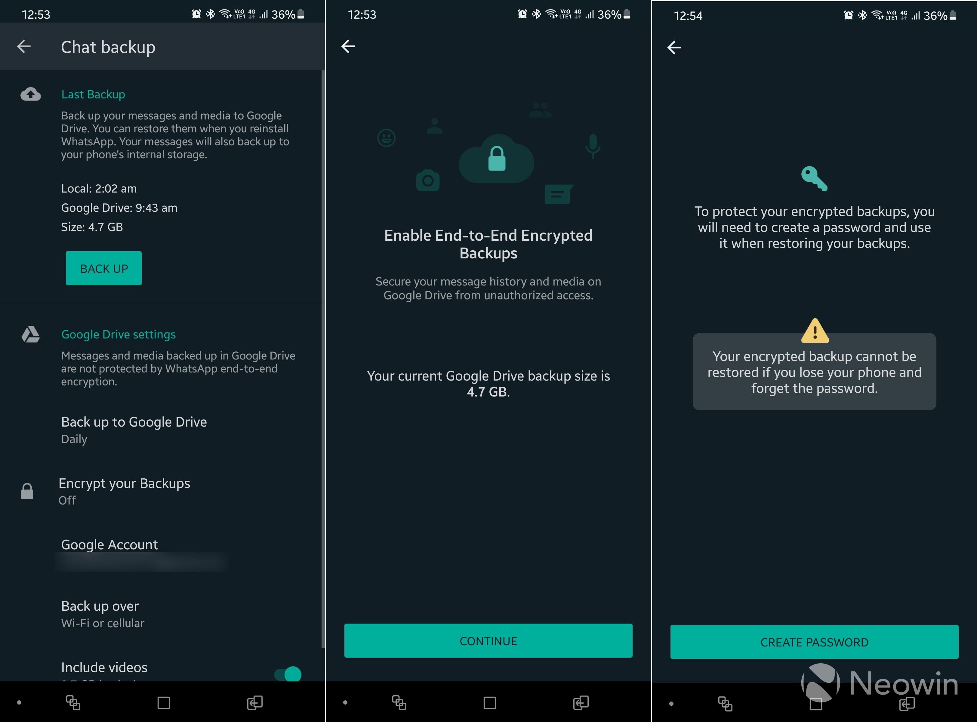 ویژگی رمزگذاری سرتاسر در فایل پشتیبان واتساپ فعلاً در نسخهی بتا اندروید (2.21.15.5) فعال شده است؛ اما انتظار میرود در ماههای آینده برای تمامی کاربران در دسترس قرار بگیرد. متأسفانه واتساپ تا این لحظه هیچ حرفی در مورد اضافه کردن این ویژگی به نسخهی iOS به میان نیاورده است.