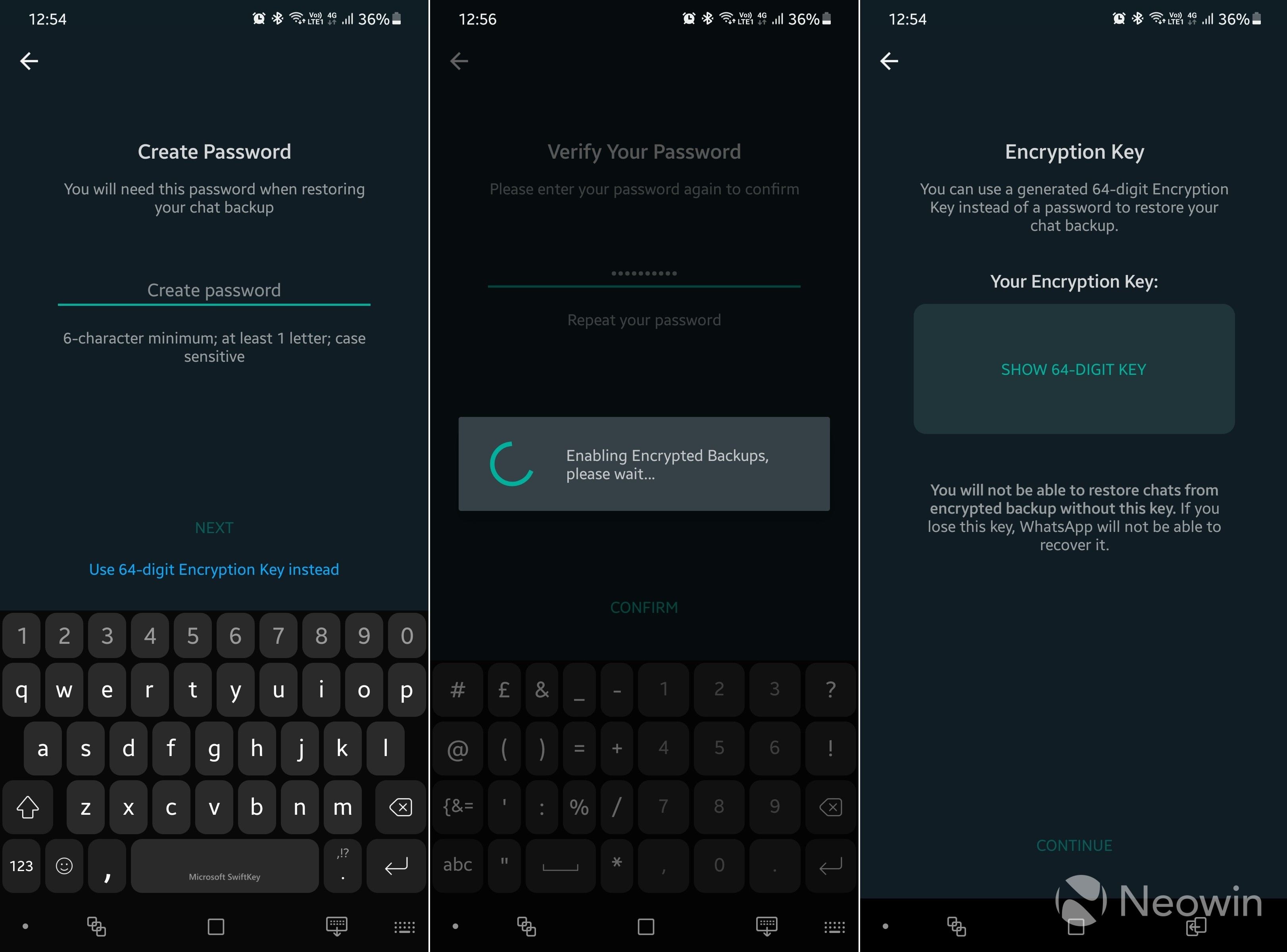 بعد از سالها انتقاد به واتساپ برای پشتیبانی نکردن از رمزگذاری سرتاسر در فایل پشتیبان واتساپ، این شبکه اجتماعی بالاخره این ویژگی را به نسخهی بتا اضافه کرد. واتساپ میگوید قابلیت رمزگذاری سرتاسر بهصورت پیشفرض روی فایل پشتیبان در گوگل درایو فعال نمیشود و باید قبل از آپلود فایل، آن را رمزگذاری کرد. کاربران باید هنگام تهیه فایل پشتیبان، رمزی امن انتخاب و آن را در جایی امن ذخیره کنند. به گفتهی واتساپ، در صورت گم شدن این رمز عبور، هیچ راهی برای بازیابی وجود نخواهد داشت. اگر نیاز به امنیت بیشتری برای فایل پشتیبان واتساپ خود دارید، میتوانید به جای ایجاد رمز معمولی، از رمزگذاری ۶۴ رقمی استفاده کنید که یک کلید رمز تصادفی ایجاد میکند. فراموش نکنید که از کلید ایجادشده پشتیبان تهیه کنید؛ چون در صورت گم شدن این کلید، هیچ کسی نمیتواند در بازیابی آن به شما کمک کند.