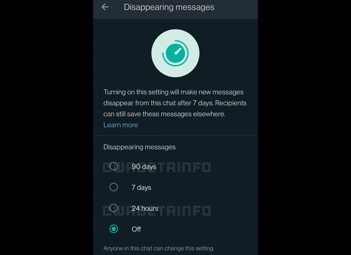 واتساپ روی اضافه کردن قابلیتی برای پاک کردن خودکار پیامها پس از گذشت ۹۰ روز کار میکند. این قابلیت در حال حاضر تنها پس از گذشت ۷ روز در دسترس است و واتساپ قصد دارد گزینه ۲۴ ساعت را نیز به لیست موارد قابل انتخاب اضافه کند.