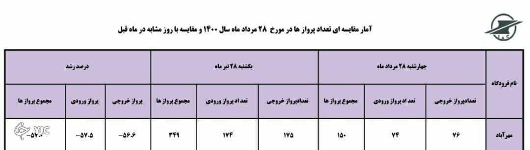 ۲۸ مرداد امسال ۷۶ پرواز خروجی و ۷۴ پرواز ورودی در فرودگاه مهرآباد انجام شده است. تعداد پرواز‌های خروجی و ورودی این فرودگاه طی روز ۲۸ مرداد به ترتیب در مقایسه با روز مشابه در تیرماه ۵۶.۶ و ۵۷.۵ درصد رشد منفی داشته است.