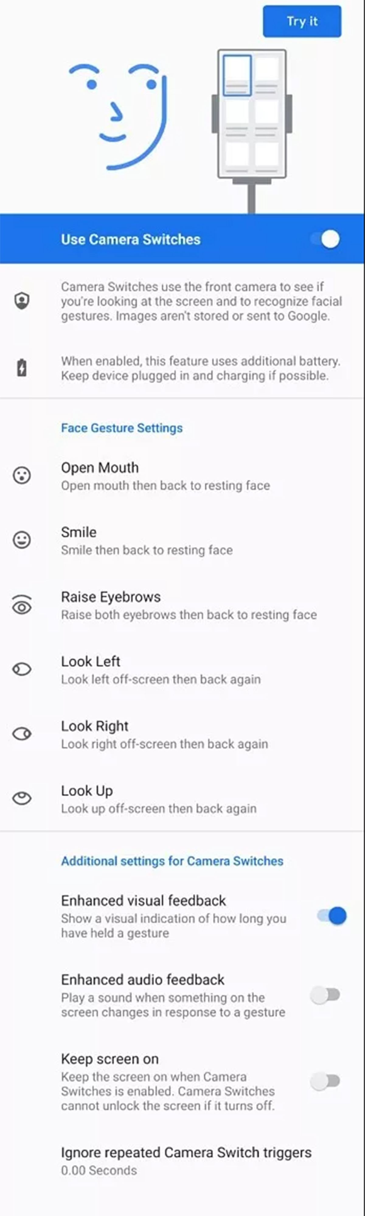 نسخه بتای Android Accessibility Suite که در اندروید ۱۲ دیده می‌شود، میزبان ویژگی جدید Camera Switches است. هنگامی‌که قابلیت مذکور فعال است، دستگاه از دوربین جلو استفاده می‌کند تا ببیند آیا به صفحه‌نمایش نگاه می‌کنید و سپس حرکات صورت را تشخیص می‌دهد.