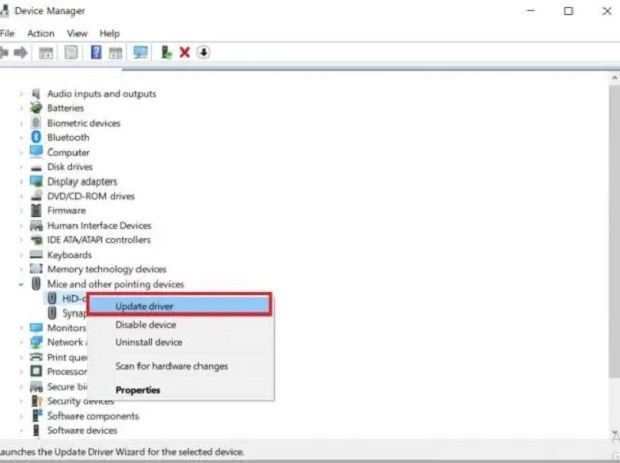 - سپس روی ماوس بی سیم خود کلیک راست کرده و گزینه Update driver را انتخاب کنید.