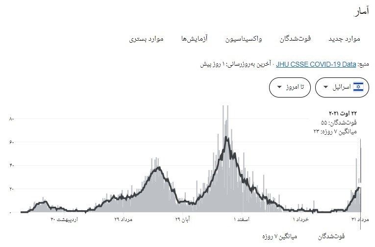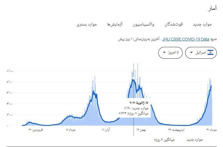 با وجود این، نمودارهای موارد ابتلا و فوتی، از وقوع پیک جدید کرونا در رژیم صهیونیستی حکایت دارد.