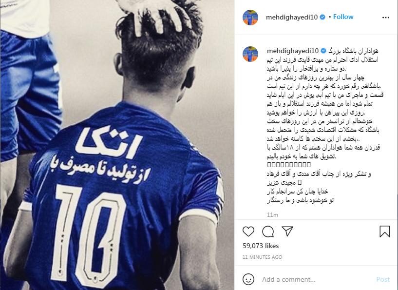 قایدی در این پست نوشت:« هواداران باشگاه بزرگ استقلال ادای احترام من مهدی قایدی فرزند این تیم دو ستاره و پرافتخار را پذیرا باشید. چهار سال از بهترین روزهای زندگی من در باشگاهی رقم خورد که هر چه دارم از این تیم است.