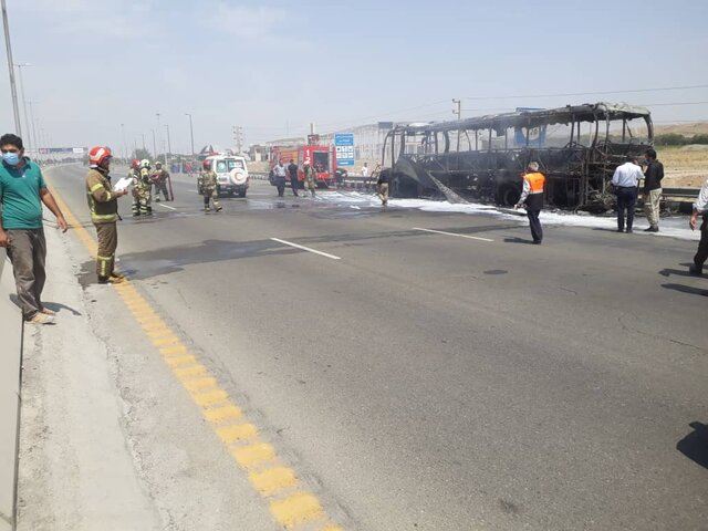 آتش گرفتن اتوبوس مسافربری در اتوبان قم - تهران
