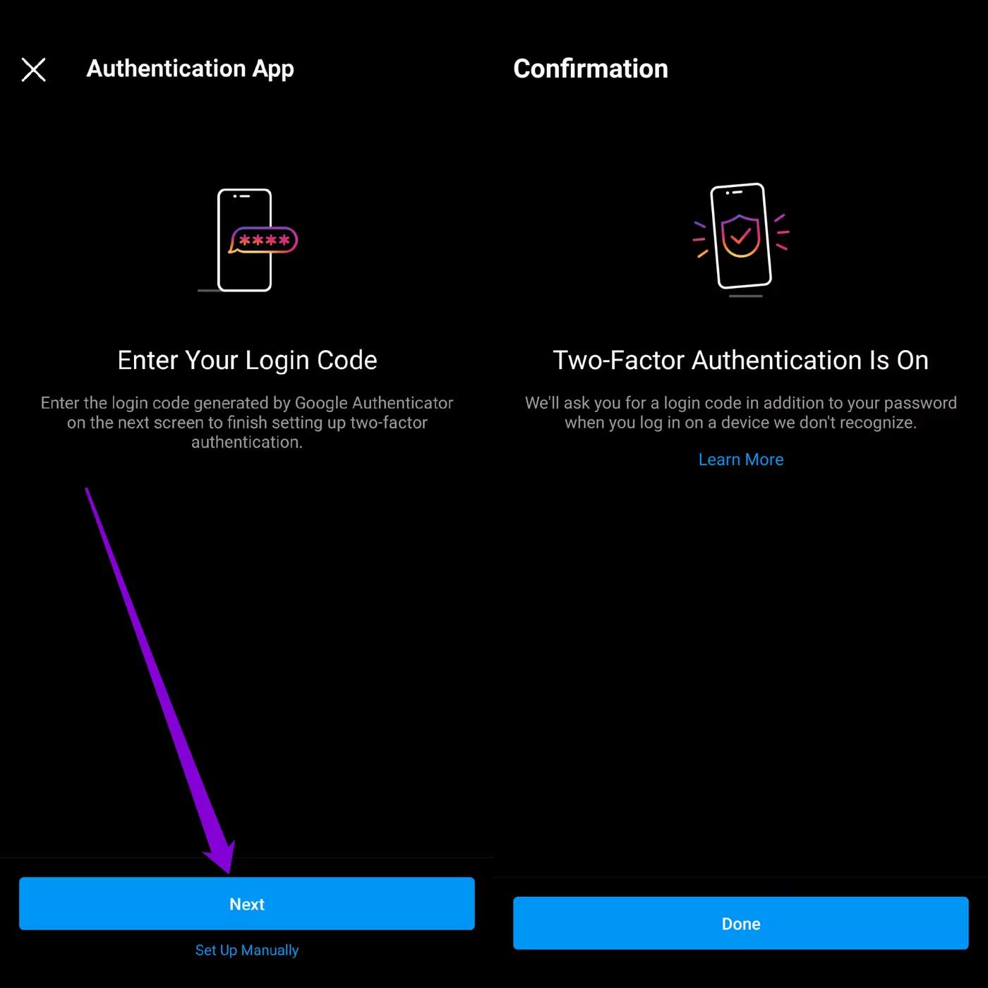 در گام بعدی اگر هیچ اپلیکیشن احراز هویتی را در گذشته روی موبایل خود نصب نکرده باشید، اینستاگرام درخواست میکند تا یک اپ فعال در این زمینه را دانلود نمایید. اینستاگرام به صورت پیشفرض دو اپلیکیشن DUO و گوگل Authenticator را به کاربران خود پیشنهاد میدهد اما امکان استفاده از سایر عناوین مانند Authy، مایکروسافت Authenticator و LastPass هم وجود دارد. پس از دانلود کردن هر کدام از موارد گفته شده، میتوانید با دنبال کردن راهنمای نمایش داده شده وارد برنامه شوید. پس از آن باید کد درج شده در اپلیکیشن احراز هویت را کپی کرده و در قسمت مخصوص موجود در اینستاگرام وارد نمایید. اگر تمامی مراحل به درستی طی شده باشد، اینستاگرام پیامی مبنی بر انجام موفقیتآمیز فرایند فعالسازی ورود دو مرحلهای نمایش خواهد داد. برای پایان کلید Done را لمس کنید.
