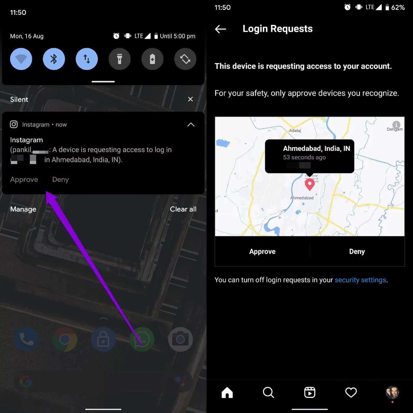 وقتی که ورود دو مرحلهای در اینستاگرام را فعال کنید، تمامی ورودها از آن پس به صورت پیشفرض تنها با درخواست و ثبت کد تایید امکانپذیر خواهند بود. در چنین حالتی اگر کاربر با کدهای ریکاوری هم وارد اکانت شود، دوباره اعلان ورود از طریق مسیرهای مشخص شده ارسال میشود. هشدار ورود به حساب کاربری در تب Activity قابل مشاهده خواهد بود و کاربر میتواند اقدام به تایید یا رد درخواست ورود کند.