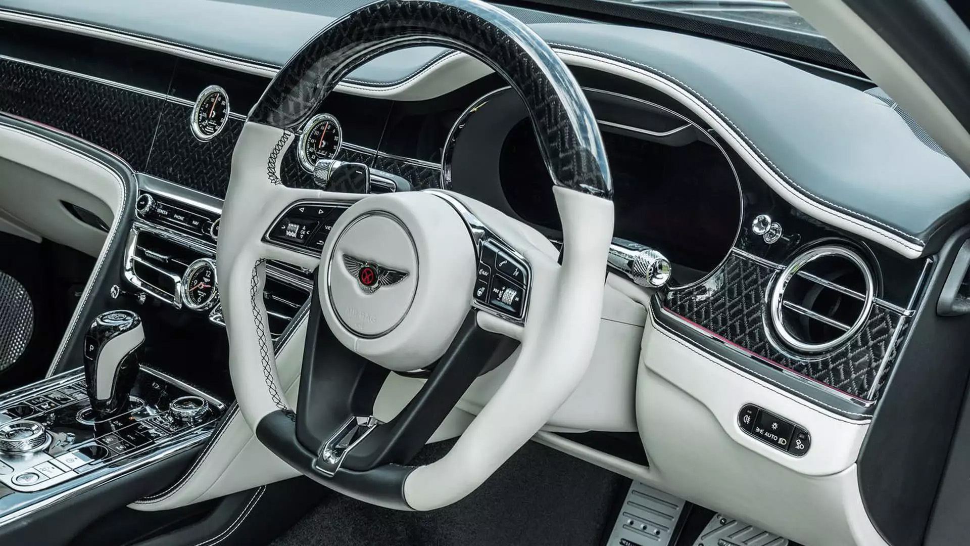 شرکت تیونینگ منصوری تغییراتی نیز در فضای داخل کابین بنتلی ایجاد کرده است که چشمنواز به نظر میرسند. از جمله این موارد میتوان به درزگیرهای جانبی منحصربفرد با صفحات ضدخش اشاره کرد که روی آنها «Mansory» و «More than Racing» نوشته شده است. همچنین چرم سفید دلپذیری روی صندلیها، پنلهای درها، پایین داشبورد و فرمان وجود دارد و این قسمتها را تزئین میکند. قسمتهای مختلف دیگر در داخل کابین از فیبر کربن سبکوزن با بافتی منحصربفرد ساخته شدهاند.