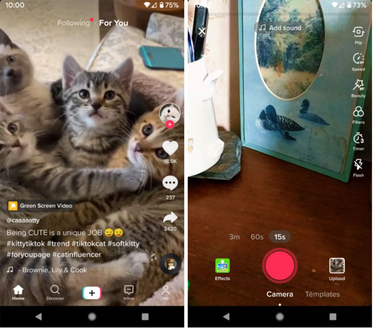نکته جالب تیکتاک که آن را محبوبتر میکند، این است که میتوانید در این پلتفرم فقط با صحبتکردن با دوربین ویدئویی عالی خلق کنید. بااینحال، اگر دوست دارید کمی محتوایتان را با جلوههای مختلف جذابتر کنید؛ ولی توانایی کار با اپلیکیشنهای ویرایش ویدئو حرفهای را ندارید، با قالبهای آماده (تمپلیت) ازپیشطراحیشده موجود در تیکتاک میتوانید شروع کنید.