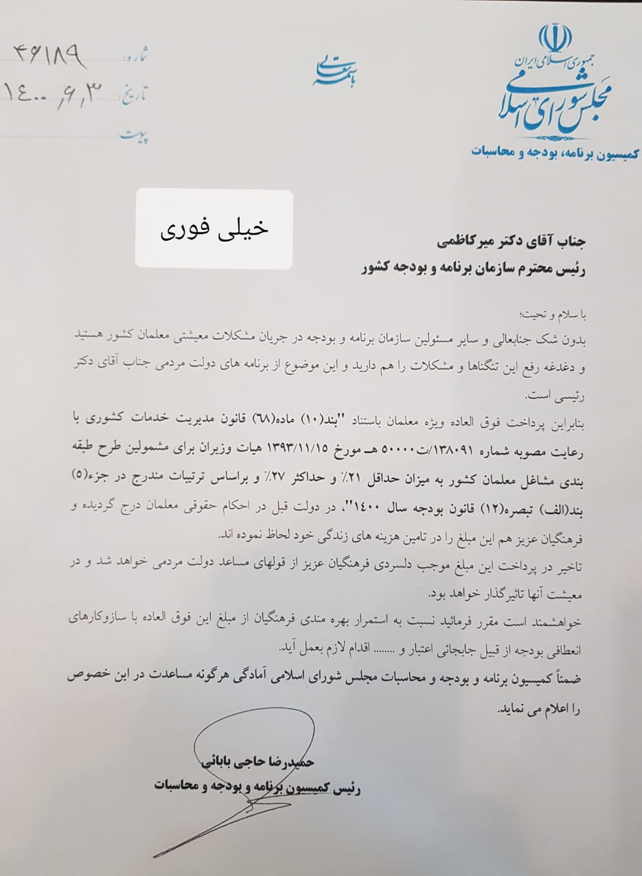 تأخیر در پرداخت این مبلغ موجب دلسردی فرهنگیان عزیز از قولهای مساعد دولت مردمی خواهد شد و در معیشت آنها تاثیرگذار خواهد بود. خواهشمند است مقرر فرمایید نسبت به استمرار بهرهمندی فرهنگیان از مبلغ این فوق العاده با سازوکارهای انعطافی بودجه از قبیل جابجایی اعتبار و ... اقدام لازم به عمل آید».