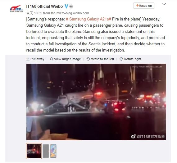 خبر آتش گرفتن گوشی در هواپیمای مسافربری که گفته میشود گلکسی A21 بوده، خبرساز شد. سامسونگ که ابتدا واکنشی به این موضوع نشان نداده بود، با انتشار بیانیهای رسمی صریحا اعلام کرد که تحقیقات خود را به صورت جدی برای بررسی موضوع آغاز میکند.