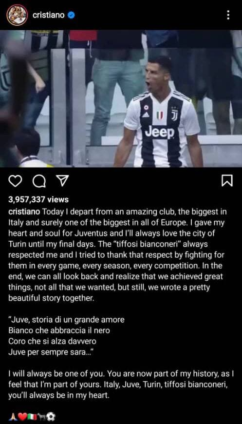 من همیشه یکی از شما خواهم بود. شما اکنون بخشی از تاریخ من هستید ، زیرا من احساس می کنم که بخشی از شما هستم. ایتالیا ، یووه ، تورین ، هواداران بیانکونری ، شما همیشه در قلب من خواهید بود.️