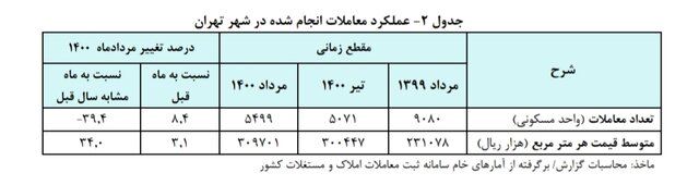 طبق اعلام بانک مرکزی، در مرداد ماه امسال متوسط قیمت یک متر مربع مسکن در شهر تهران ۳۰ میلیون و ۹۷۰ هزار تومان بوده که نسبت به ماه قبل و مدت مشابه در سال قبل به ترتیب ۳.۱ و ۳۴ درصد افزایش یافته است.