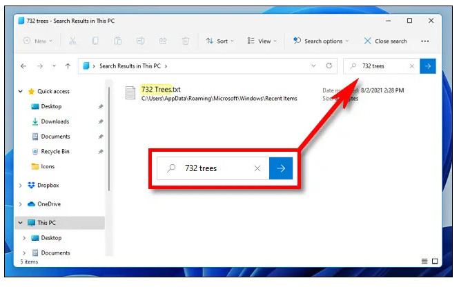 همچنین می توانید فایل ها را در File Explorer جستجو کنید. کافی است File Explorer را با استفاده از Windows+e یا با کلیک روی نماد پوشه در نوار وظیفه خود باز کنید. در گوشه سمت راست بالای هر پنجره، روی نوار جستجو کلیک کرده و جستجوی خود را تایپ کنید. کمی وقت بگذارید و بعد از چند دقیقه لیستی از هر نتیجه مطابقت را در زیر مشاهده خواهید کرد. از آنجا می توانید فایل را باز کنید، کپی کنید یا در صورت لزوم آن را حذف کنید.
