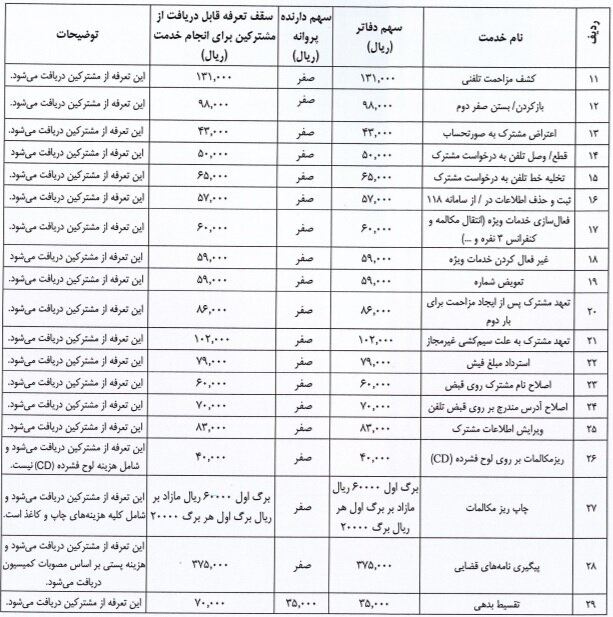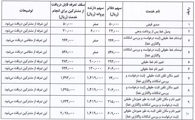 تعرفه ارایه خدمات تلفن ثابت شامل هزینه صدور قبض، وصل خط پس از پرداخت بدهی، ثبتنام خط حقیقی، کشف مزاحمت تلفنی، اعتراض مشترک به صورتحساب و چاپ ریزمکالمات، تصویب شد.