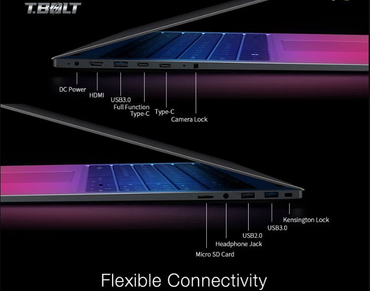 Teclast Tbolt 20 pro با دو درگاه USB 3.0 و دو درگاه Type-C قابلیت اتصال بی عیب و نقصی را ارائه می دهد. پورت های این لپ تاپ به راحتی می توانند تمام نیازهای شما را مدیریت کنند زیرا پورت ها از انتقال داده، شارژ سریع PD و خروجی صدای ویدئو DisplayPort پشتیبانی می کنند. جدا از این موارد، جک هدفون، درگاه کارت MicroSD ، DC Power و قفل دوربین نیز وجود دارد. با وجود این اطلاعات، متأسفانه قیمت و جزئیات در دسترس بودن این لپ تاپ هنوز در دسترس نیست.