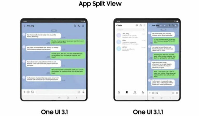 تغییر بزرگ دیگری که در این نسخه از رابط کاربری سامسونگ گنجانده شده، قابلیت App Split View است که در زمان کار با اپ‌های پیام‌رسان به کمک کاربر می‌آید. به لطف این ویژگی جدید، کاربر می‌تواند فهرستی از پیام‌ها را در سمت چپ نمایشگر داشته باشد و پیام منتخب خود را در سمت راست مشاهده کند.