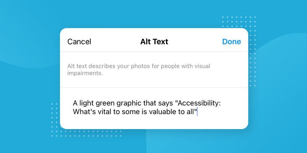 دریافت تمام این اطلاعات در هنگام گشت و گذار در اینستاگرام و بررسی پستها برای کاربران به یک اندازه اهمیت دارد. اگر فردی برای تصویری متن جایگزین (alt) نوشته باشد، تصویر به صورت صوتی برایش توصیف میشود و ممکن است تصویر مثلا به این شکل توصیف شود: «من و امیر در دریا ایستادهایم و تا زانو در آب هستیم، ترس در چهره امیر کاملا مشخص است و من در حالی که خرچنگ مردهای را در دستم گرفتهام، او را میترسانم و میخندم».