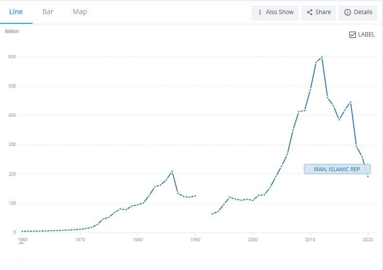 این درحالی است که اقتصادهای ترکیه و عربستان با بیش از ۷۰۰ و امارات بیش از ۴۰۰ میلیارد دلار بالاتر از ایران قرار دارند، در صورتی که اگر بخواهیم چند مقایسه کوچک بین ایران و ترکیه داشته باشیم، می توان به ذخایر نفتی اشاره کرد که این میزان در ایران بسیار بالاتر از ترکیه است و در رابطه با عربستان هم می توان به فقدان اطلاعات دانش بنیانی داخلی آن استناد کرد که این مقدار برای ایران بیشتر داخلی است تا خارجی.