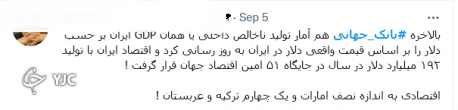 در ابتدای لیست بانک جهانی آمریکا با حدود ۲۱ هزار و چین با ۱۴ هزارمیلیارد دلار قرار دارند حتی کشورهایی مانند مصر، ونزوئلا و ویتنام هم در رتبههای بسیار بالاتری از ایران هستند.