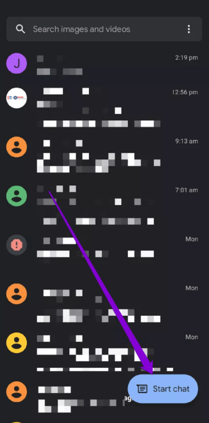 قدم اول: اپلیکیشن Messages را روی گوشی باز کنید. سپس روی Start Chat اشاره کنید تا یا یک پنجره چت جدید باز شود یا اینکه یکی از پنجرههای چت موجود از قبل را انتخاب کرده و باز کنید.