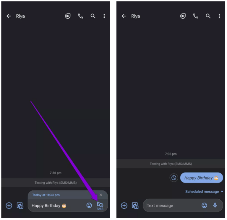 قدم سوم: با انجام مراحل بالا، علامت یک ساعت کوچک روی گزینه Send برایتان پدیدار میشود، به این معنا که پیامک شما دارد زمانبندی میشود. حالا مجددا روی دکمه Send اشاره کنید تا پیامک شما با موفقیت زمانبندی شود.
