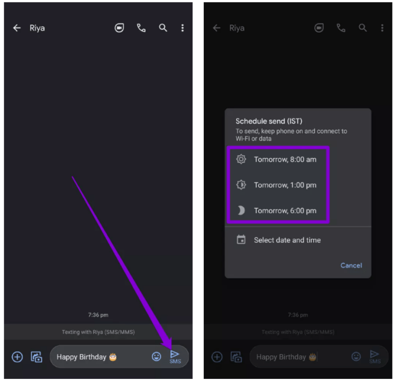 قدم سوم: حالا اینجا میتوانید زمان و تاریخ مد نظرتان را برای زمانبندی پیامک تعیین کنید. اینجا در فیلد خالی، متن مد نظرتان را بنویسید و سپس گزینه Send را بزنید.