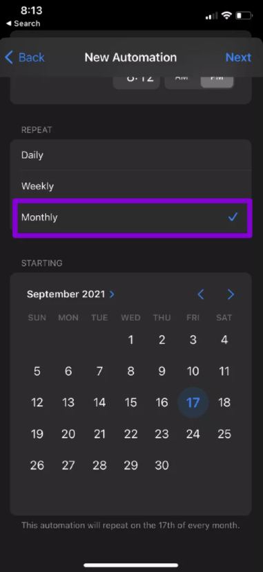 قدم سوم: در بخش Repeat، گزینه Monthly را انتخاب کنید و سپس تاریخی که میخواهید در آن پیامک ارسال شود را برگزینید. حالا از گوشه بالا و سمت راست صفحه روی دکمه Next اشاره کنید.