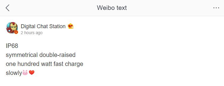 همین منبع اکنون اطلاعات بیشتری در مورد گوشی هوشمند جدید ردمی به اشتراک گذاشته و این بار در پست جدیدش ادعا کرده این گوشی هوشمند از شارژ سریع ۱۰۰ واتی پشتیبانی میکند و با استاندارد IP68 در برابر نفوذ گرد و غبار و آب مقاوم خواهد بود.