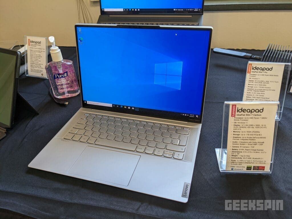 بر اساس گزارشها، یکی از لپ تاپهای جدید این شرکت، IdeaPad Slim 7 Pro است. این نوت بوک بزرگ ۱۶ اینچی ۴.۶ پوندی با صفحه نمایش لمسی و نرخ تازه سازی ۱۲۰ هرتز معرفی میشود. این نوت بوک دارای پردازنده داخلی 5800H و تراشههای گرافیکی مجزا است. این دستگاه تا ۱۶ گیگابایت رم و حداکثر یک ترابایت حافظه SSD را پشتیبانی میکند. باتری با یک بار شارژ تا ۱۲.۵ ساعت دوام میآورد. این تبلت همچنین دارای بلندگوهای با پشتیبانی Dolby Atmos، دو درگاه USB و درگاههای USB-C، HDMI و SD برای افزودن فضای ذخیره سازی بیشتر است.