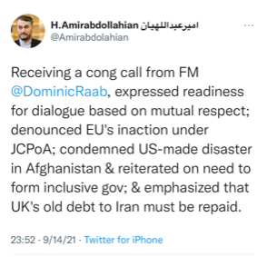 به گزارش سایت طلا،حسین امیرعبداللهیان وزیر امور خارجه جمهوری اسلامی ایران درباره رایزنی تلفنی روز دوشنبه اش با «دومینیک راب» وزیر خارجه انگلیس در توئیتی نوشت: در تماس تبریک وزیر خارجه انگلیس برای گفتگوی مبتنی بر احترام متقابل ابراز آمادگی کردم؛ بیعملی اتحادیه اروپا در برجام را به شدت مورد انتقاد قرار دادم؛ فاجعه ساخته آمریکا در افغانستان را محکوم و بر لزوم تشکیل دولت فراگیر تأکید کردم؛ و تصریح کردم که بدهی دیرینه انگلیس به ایران باید پرداخت شود.