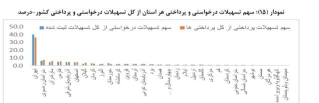 بررسی تسهیلات به تفکیک استانی نیز حاکی از آن است که استان تهران که پرجمعیت ترین استان کشور و دارای بیشترین جمعیت شاغل است بیشترین سهم از تسهیلات پرداختی و درخواستی را به خود اختصاص داده و پس از تهران، استانهای خراسان رضوی و مازندران سهم بالایی از تسهیلات را جذب کرده اند.