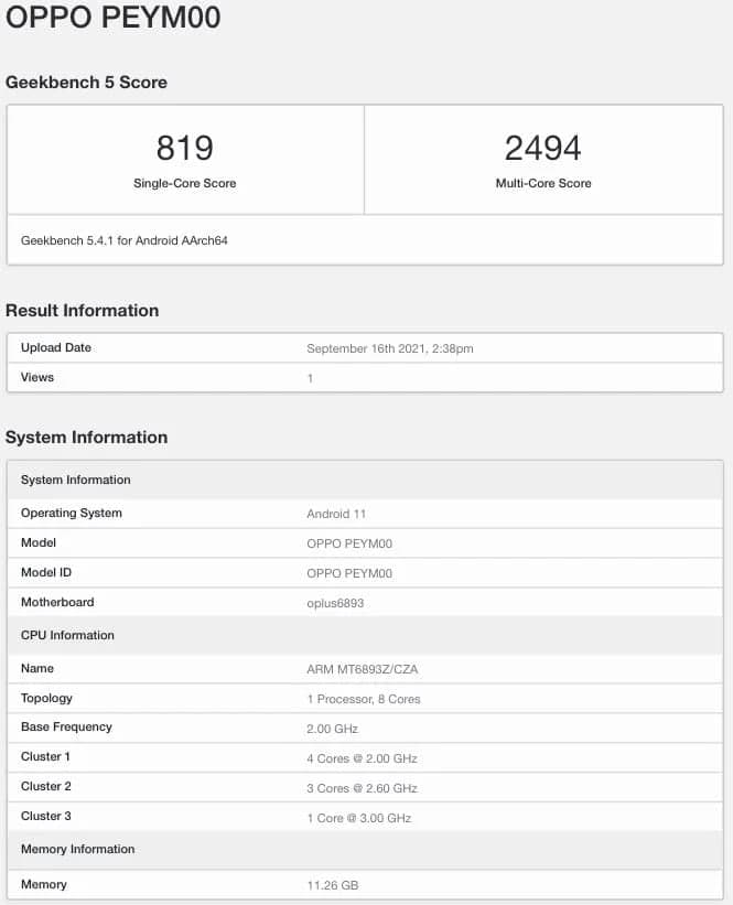 مشخصات گوشی منتسب به اوپو K9 پرو با شماره مدل PEYM00 در سایت بنچمارک گیکبنچ ۵ مشاهده شده است. طبق شواهد ارائه شده، این گوشی از پردازنده MT6893Z/CZA شرکت مدیاتک بهره میبرد که شامل چهار هسته با فرکانس ۲ گیگاهرتز، سه هسته با فرکانس ۲.۶۰ گیگاهرتز و فرکانس اصلی با سرعت ۳ گیگاهرتز میشود. از مشخصات این پردازنده میتوان نتیجه گرفت که K9 پرو از چیپست دیمنسیتی ۱۲۰۰ بهره خواهد برد. نسخه استاندارد این گوشی با چیپست اسنپدراگون ۷۶۸G روانه بازار شده بود.