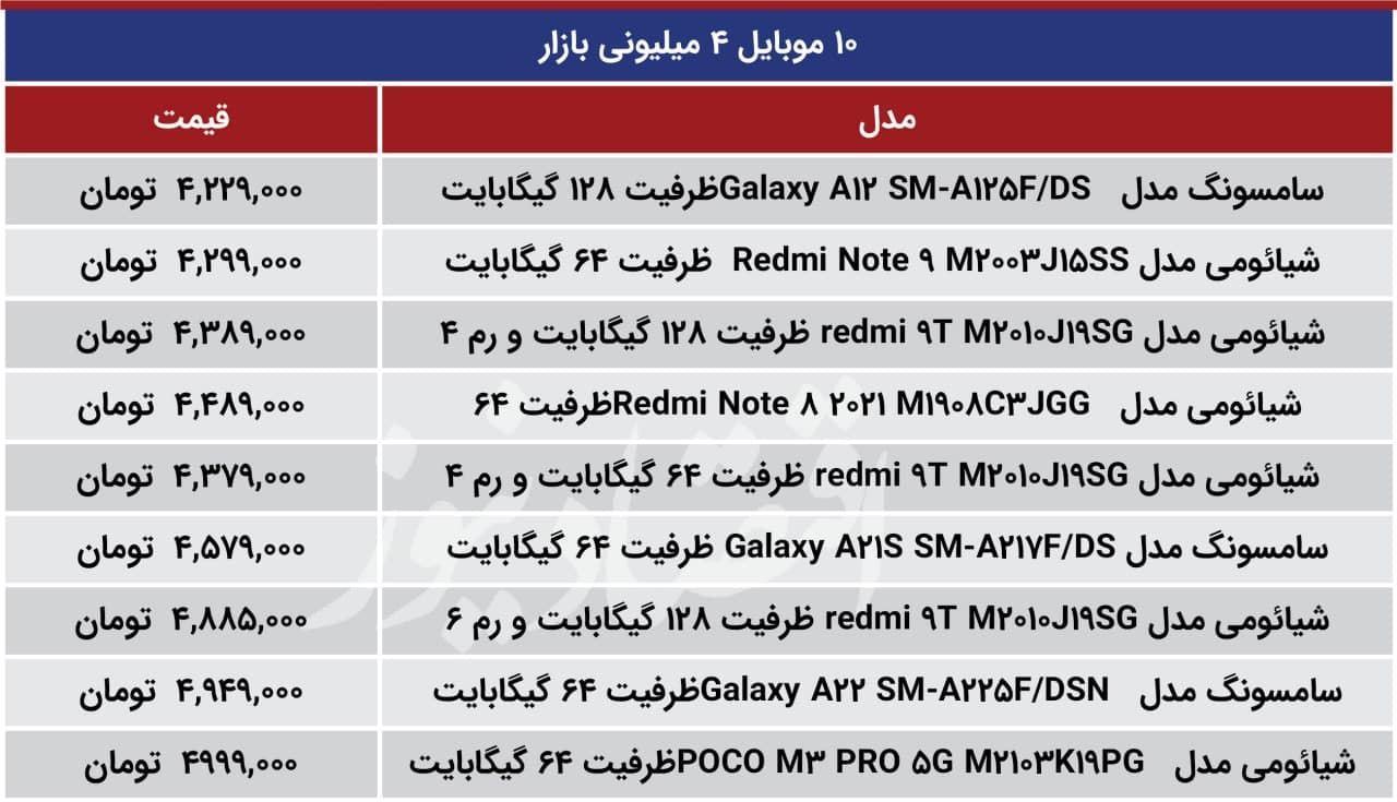 در ادامه فهرست ۱۰ گوشی موبایل در محدوده قیمتی ۴ میلیون تومان از سایت‌های فروش اینترنتی جمع آوری شده است؛