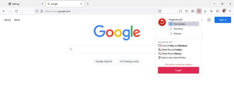 اما اگر میبینید که مرتبا به پاک کردن تاریخچهی مرورگر نیاز پیدا میکنید، بهتر است از دکمهی فراموشی فایرفاکس بهره ببرید. این دکمه ۳ دورهی زمانی مختلف را پیشنهاد میدهد و پس از انتخاب پنجرههای شما را میبندد، مرورگر و کوکیهای آن را پاک میکند و یک پنجرهی جدید و بدون اطلاعات از قبل ثبت شده را باز میکند.