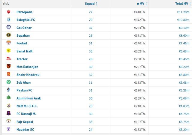 در ادامه جدول کلی ارزشگذاری تیمهای ایرانی را مشاهده میکنید: