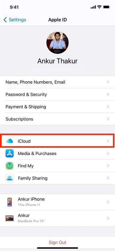 تنظیمات آیفون را باز کنید و روی نام خودتان در بالای صفحه ضربه بزنید.