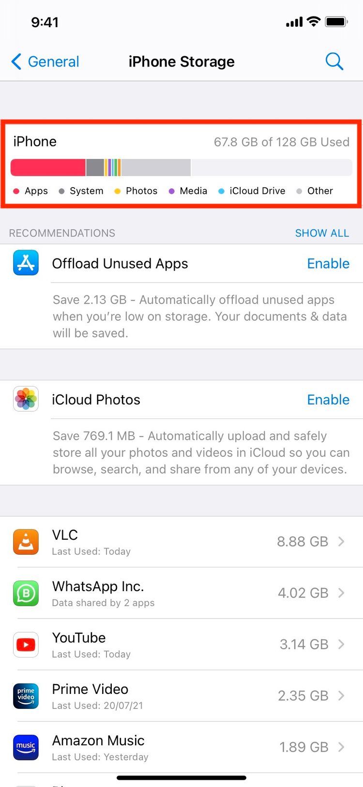 در مسیر بالا میتوانید میزان فضای خالی آیفون خود را ببینید. برای نصب آپدیت iOS 15 روی آیفون خود باید حداقل ۶ یا ۷ گیگابایت فضای خالی داشته باشید. اگر چنین فضایی در اختیار ندارید، باید برخی فایلها یا برنامهها را حذف کنید.