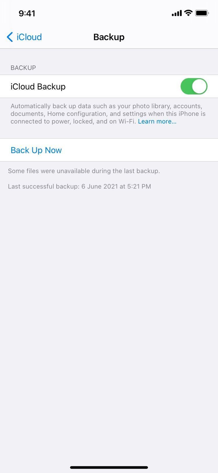 در اینجا آخرین تاریخ و ساعت بکاپگیری موفق را مشاهده میکنید. اگر تاریخ آن قدیمی بود، روی گزینه Back Up Now ضربه بزنید تا شروع به بکاپگیری کند.
