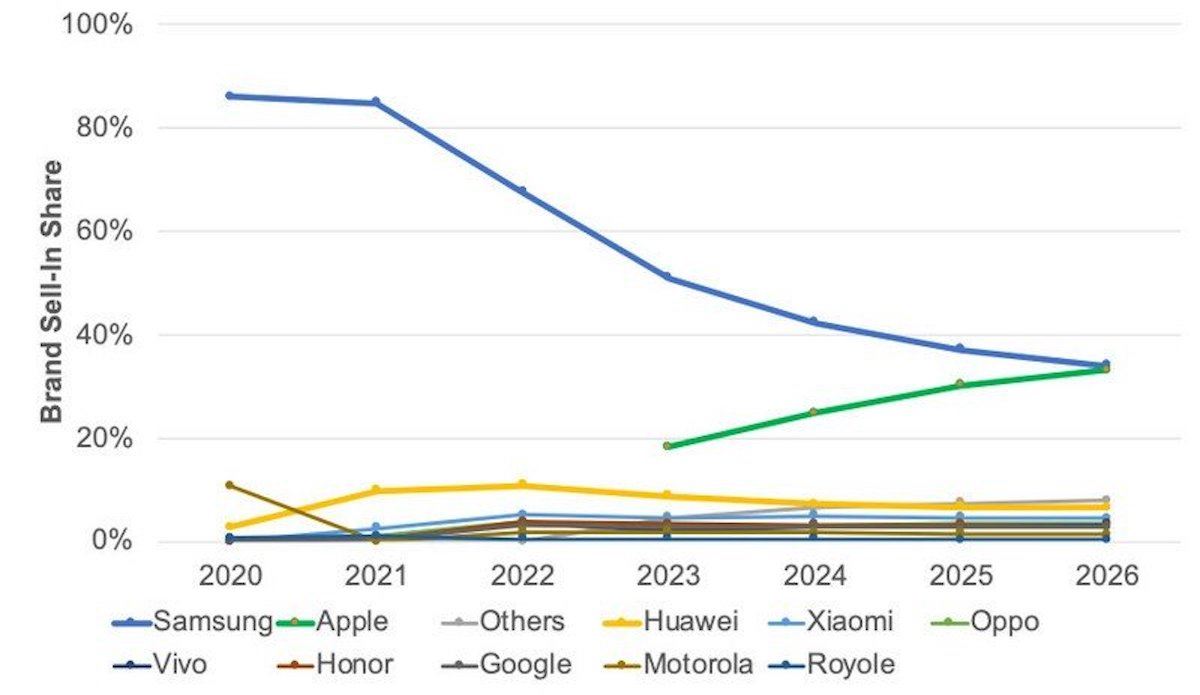ما سامسونگ در آینده باید با شرکتهای زیادی رقابت کند. کمپانیهایی مانند گوگل، ویوو، اوپو، شیائومی و حتی هواوی میخواهند وارد این بازار شوند و سهمی از آن داشته باشند. البته نباید بزرگترین رقیب کرهایها یعنی اپل را هم فراموش کنیم. این کمپانی احتمالا سال ۲۰۲۳ وارد این بخش از بازار میشود و طبق پیشبینی DCSS، تا سال ۲۰۲۶، سهمش در بازار با سامسونگ برابر خواهد شد.