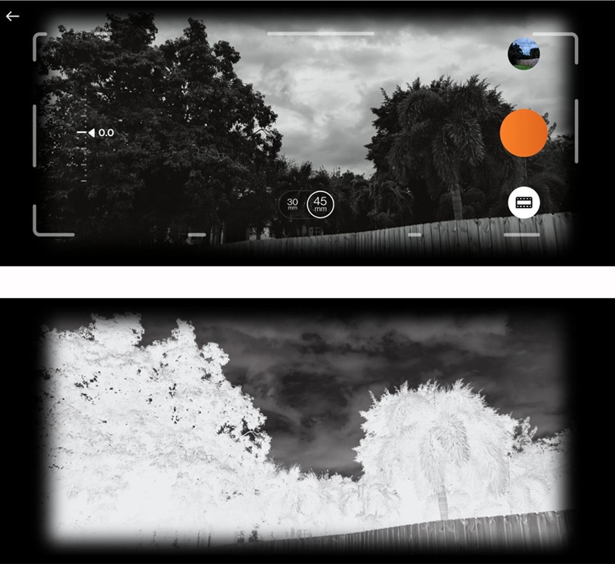 در اینجا، سه گزینه دراختیار شما قرار میگیرد که باید از بین آنها حالت مدنظرتان را انتخاب کنید. این گزینهها دو حالت رنگی و یک پریست رنگ طبیعی کمی تغییریافته و یک حالت سیاهوسفید پیشفرض براساس فیلم Ilford Delta 400 را شامل میشوند. همچنین، میتوانید فاصله کانونی خود را از ۴۵ به ۳۰ میلیمتر عریضتر تغییر دهید که درنهایت دوربین را به لنز فوقعریض تبدیل میکند. درضمن، امکان کنترل اکسپوژر نیز وجود دارد.
