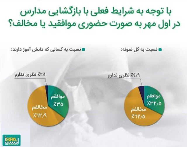 در نظرسنجی اخیر مرکز افکارسنجی دانشجویان ایران (ایسپا) در خصوص "بازگشایی مدارس در اول مهرماه به صورت حضوری با توجه به شرایط فعلی کرونا"، مشخص شد که ۶۲.۵ درصد از کل جامعه آماری با این موضوع مخالف هستند.