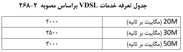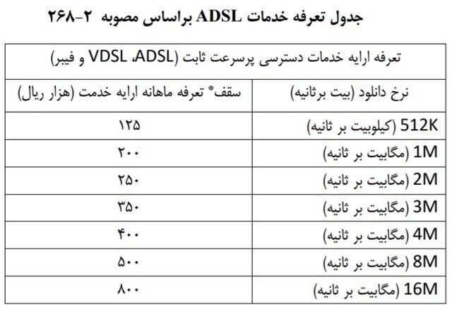 تعرفه ارائه خدمات اینترنت پرسرعت ثابت ADSL ،VDSL ،FTTH بر اساس تعرفه تعیینشده در مصوبات شماره ۲۶۶ و ۲-۲۶۸ کمیسیون تنظیم مقررات ارتباطات محاسبه میشود. براساس مصوبه ۲۶۶ کمیسیون تنظیم مقررات ارتباطات، ارایهکنندگان خدمات دسترسی به اینترنت پرسرعت ثابت از طریق فناوریهای سیمی (سیم مسی و فیبر) باید جداول تعرفهای خود را مبتنی بر سرعت و به صورت غیرحجمی (based Connection) تنظیم کنند. جدول تعرفه خدمات ADSL و VDSL در زیر آمده است.