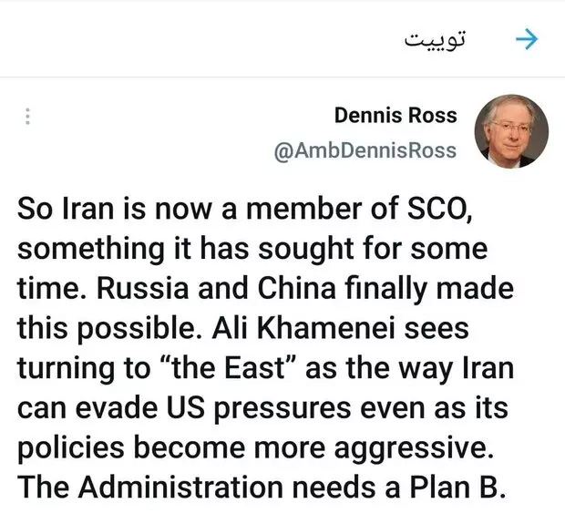 «دنیس رأس» دیپلمات ارشد و مشاور ویژه اوباما (رئیس جمهور سابق آمریکا) در مسائل خاورمیانه و ایران در صفحه شخصی خود در توئیتر به تأثیر عضویت ایران در سازمان شانگهای برای خنثیسازی تحریمها اشاره کرد و نوشت: اکنون ایران عضو دائم سازمان شانگهای است. چیزی که از مدتها پیش به دنبال آن بود. سرانجام روسیه و چین این امکان را فراهم کردند.